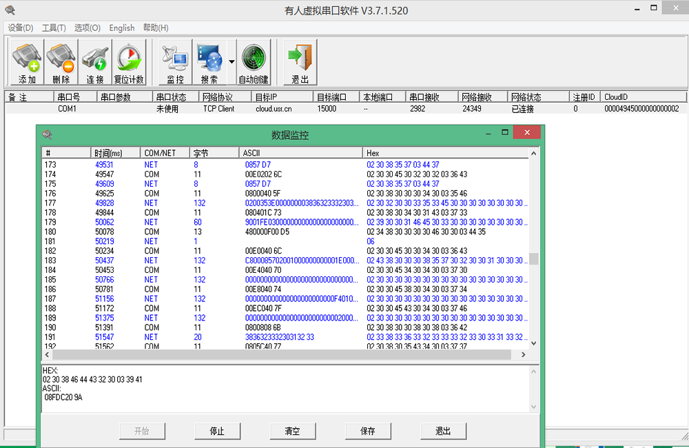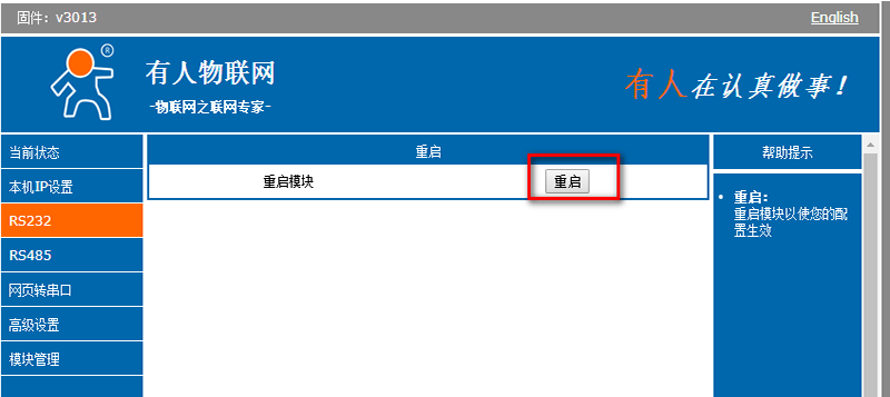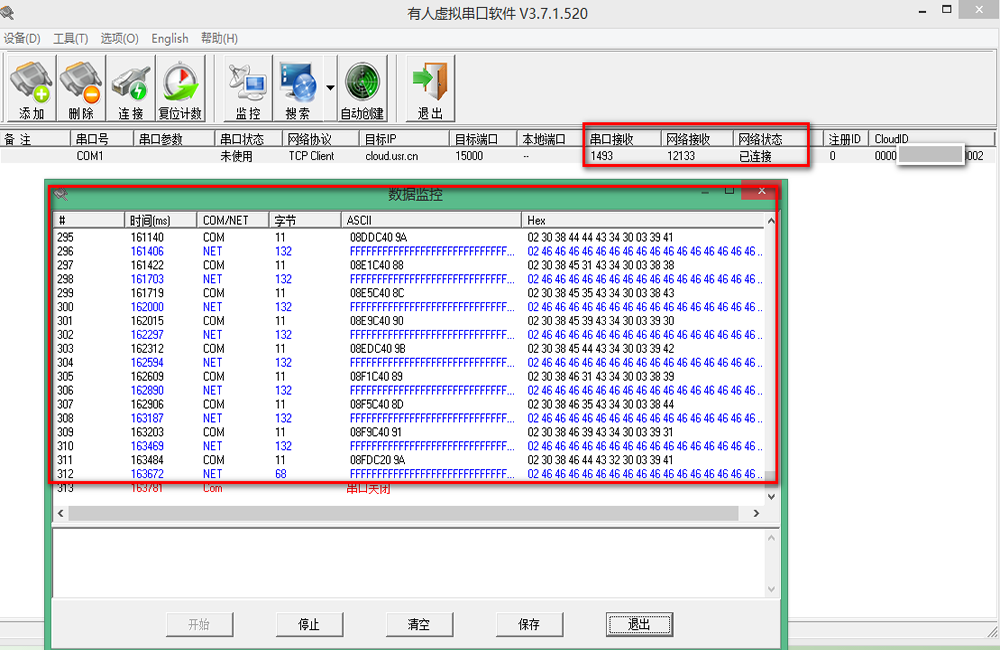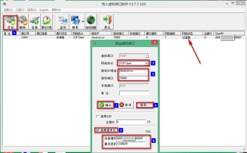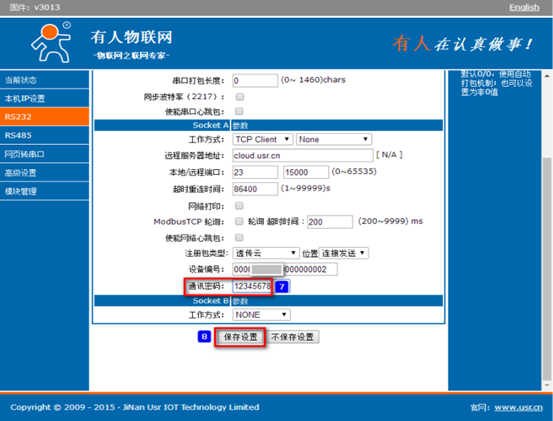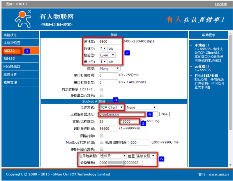 設(shè)置工作方式為“TCP CLIENT”,遠(yuǎn)程服務(wù)器地址:cloud.usr.cn,端口號:15000,注冊包類型選為“透傳云”,“連接發(fā)送”,填寫“設(shè)備編號”及“通訊密碼”,點(diǎn)擊“保存”,然后點(diǎn)擊“重啟”。