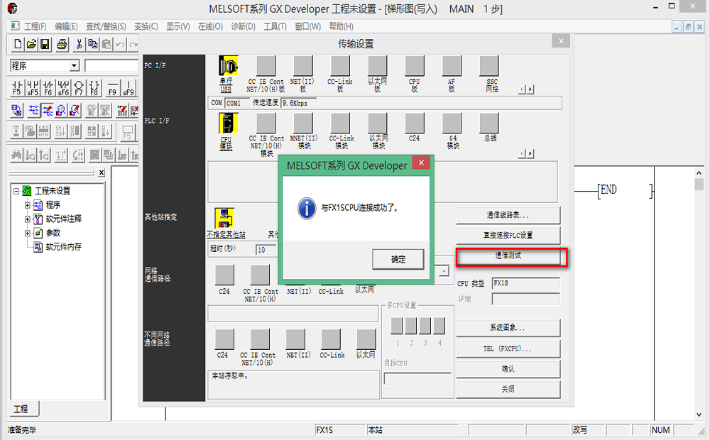 十、點(diǎn)擊“通信測試”,會顯示與PLC連接成功,然后點(diǎn)擊“確定”