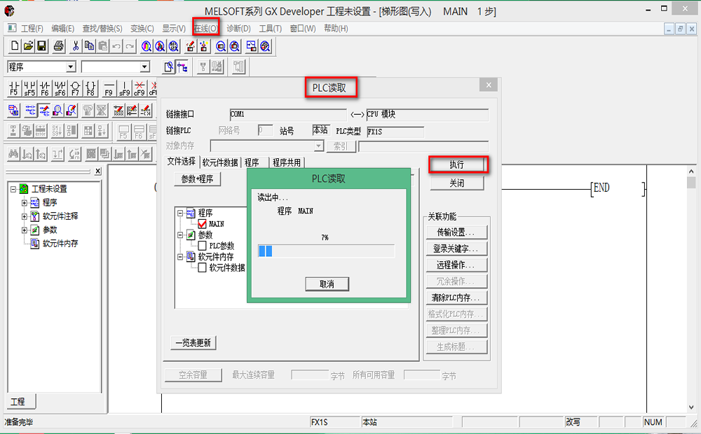 十一、退出此界面,點(diǎn)擊“在線-PLC讀取”,點(diǎn)擊“執(zhí)行”,會顯示下載進(jìn)度