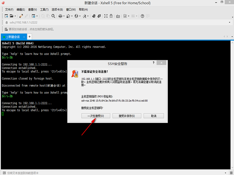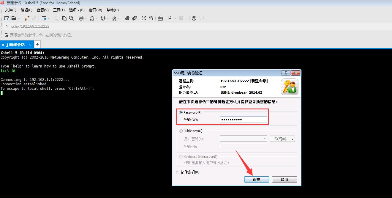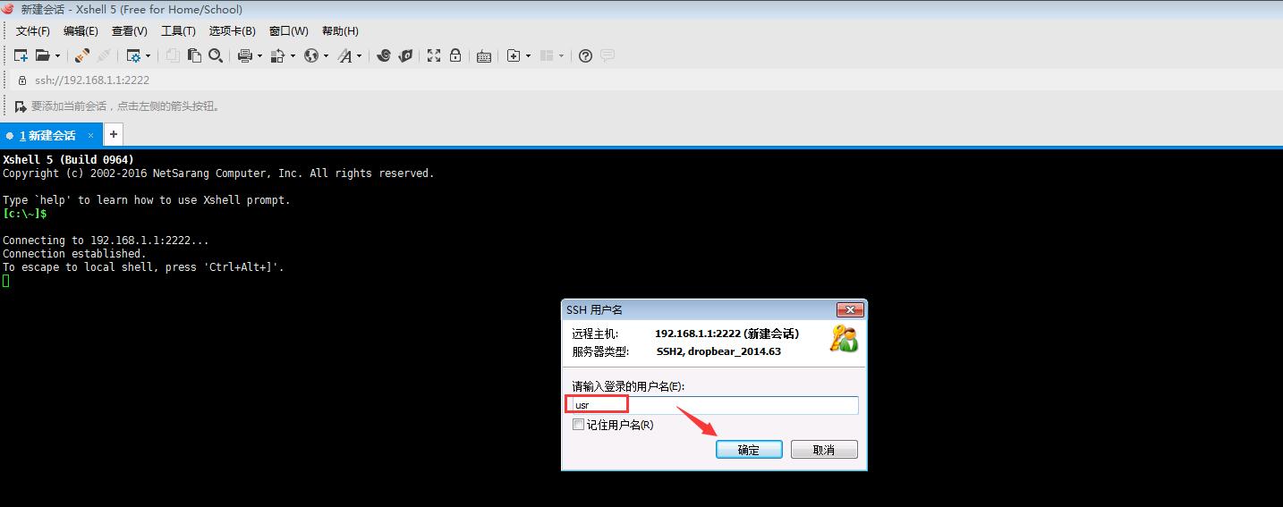 6、協(xié)議選為ssh 主機(jī)填寫192.168.1.1 端口號(hào)填寫2222,點(diǎn)擊“確定”