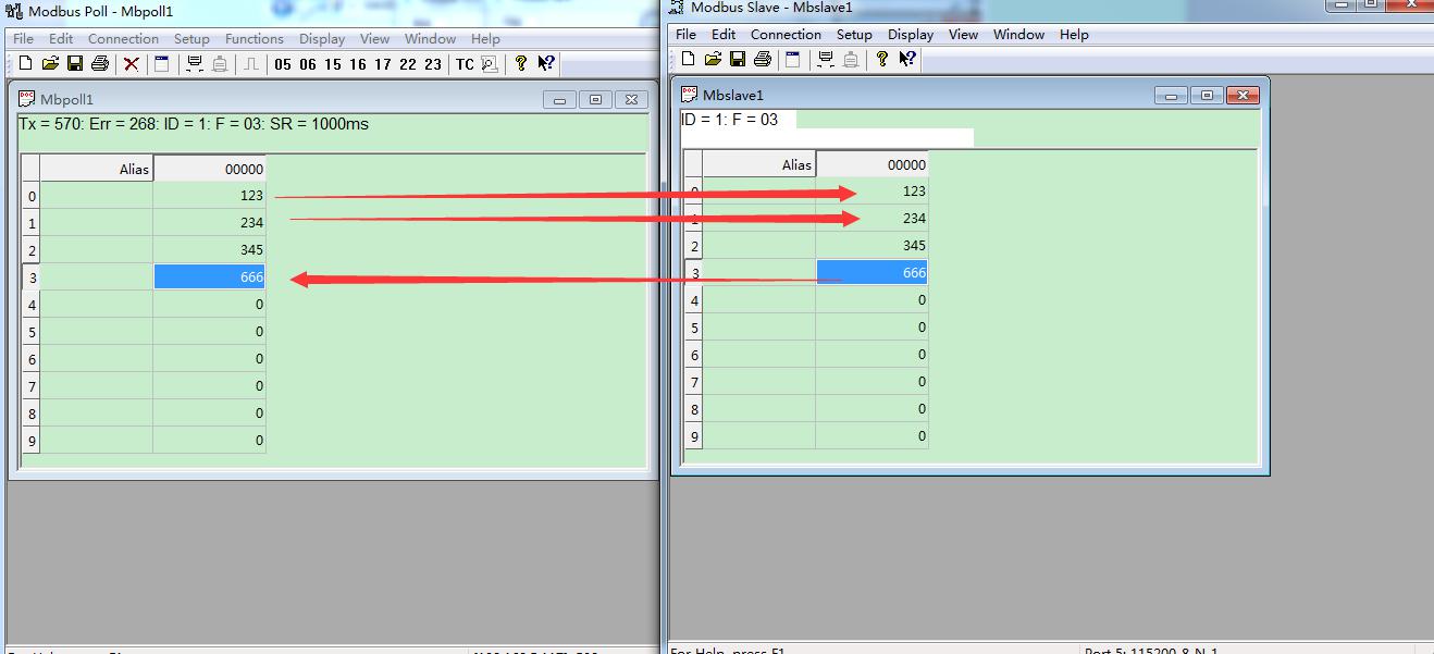 7、至此, 我們就可以通過 Modbus Poll 讀取 Modbus Slave 的數(shù)據(jù)了, 網(wǎng)絡(luò)到串口的數(shù)據(jù)流向是: Modbus Poll網(wǎng)絡(luò)端->511以太網(wǎng)口->協(xié)議轉(zhuǎn)換(Modbus TCP 轉(zhuǎn) Modbus RTU) ->511 串口-> Modbus Slave 串口端;;串口到網(wǎng)絡(luò)的數(shù)據(jù)流向是接到查詢指令: Modbus Slave 串口端->511串口->Modbus RTU 轉(zhuǎn) Modbus TCP->511以太網(wǎng)口->Modbus Poll網(wǎng)絡(luò)端