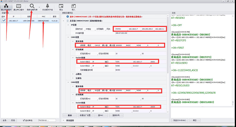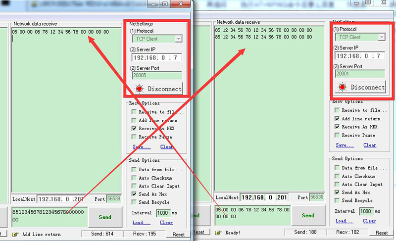 Can1為192.168.0.7-20001;can2位192.168.0.7-20005兩個網(wǎng)絡助手之間的通信如下(數(shù)據(jù)格式為13字節(jié),按16進制發(fā)送)