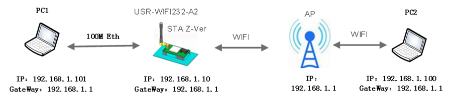 高性能模塊(一下簡(jiǎn)稱A2)通過Wi-Fi接到AP上,PC1通過以太網(wǎng)接到A2模塊上,這時(shí)A2模塊相當(dāng)于一個(gè)透明的設(shè)備,PC1和PC2在同一個(gè)局域網(wǎng),相互通訊不受任何限制,如果AP可以聯(lián)網(wǎng),那么PC1也是可以上網(wǎng)的。下面介紹如何設(shè)置A2模塊,才能實(shí)現(xiàn)這種功能。