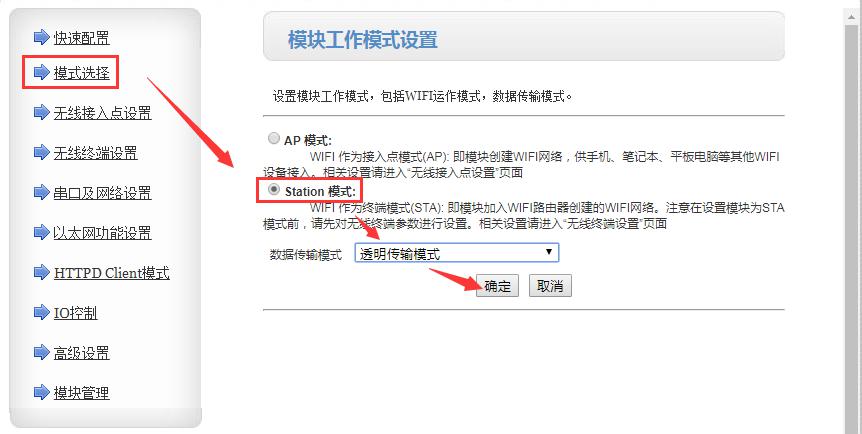 C. 模式選擇中選擇”Station模式”和”透明傳輸模式”,然后點(diǎn)擊確定,這個(gè)時(shí)候不用重啟,等著全部設(shè)置完成后,一起重啟