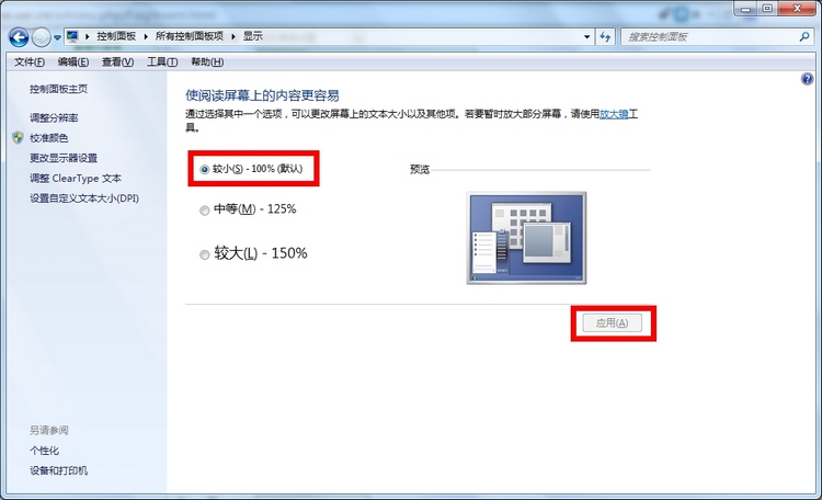 選擇100%,點(diǎn)擊“應(yīng)用”,注銷之后即可正常顯示。