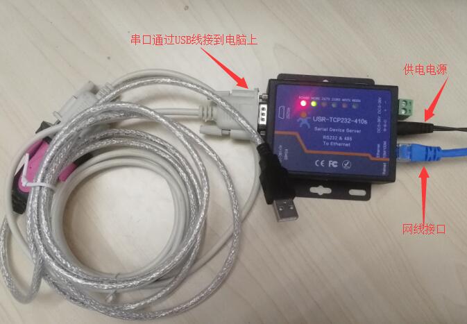 1. 將410S(USR-TCP232-410S,簡稱 410S下同)的串口通過串口線(或USB 轉(zhuǎn)串口線)與計算機相連接,通過網(wǎng)線將 410 的網(wǎng)口 PC 的網(wǎng)口相連接,檢測硬件連接無錯誤后,接入我們配送的電源適配器,給 410 供電。觀察指示燈狀態(tài)確定410是否正常工作:電源指示燈常亮,工作指示燈閃爍。