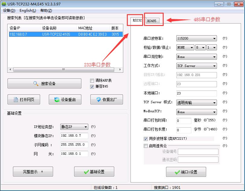 4. 打開設(shè)置軟件,點擊“搜索設(shè)備”當搜索列表中出現(xiàn)410的設(shè)備后,單擊搜索到的設(shè)備,查看其配置信息(上圖為默認配置信息)。