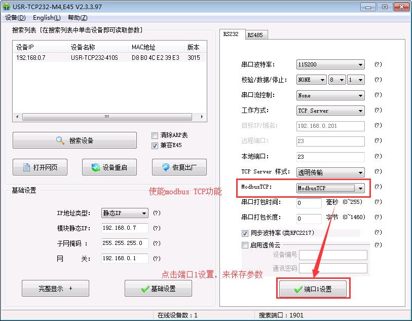 5. 下圖中使能modbus TCP功能,設(shè)置完成后,重新搜索一次,確認參數(shù)是否修改成功