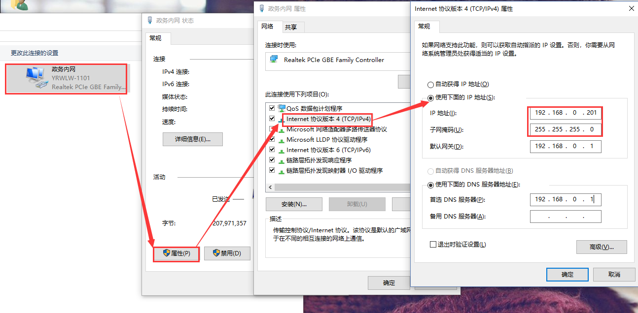 3. 給電腦設(shè)置靜態(tài)IP,要與410S的IP在同一個網(wǎng)段(410S的IP地址出廠默認:192.168.0.7)