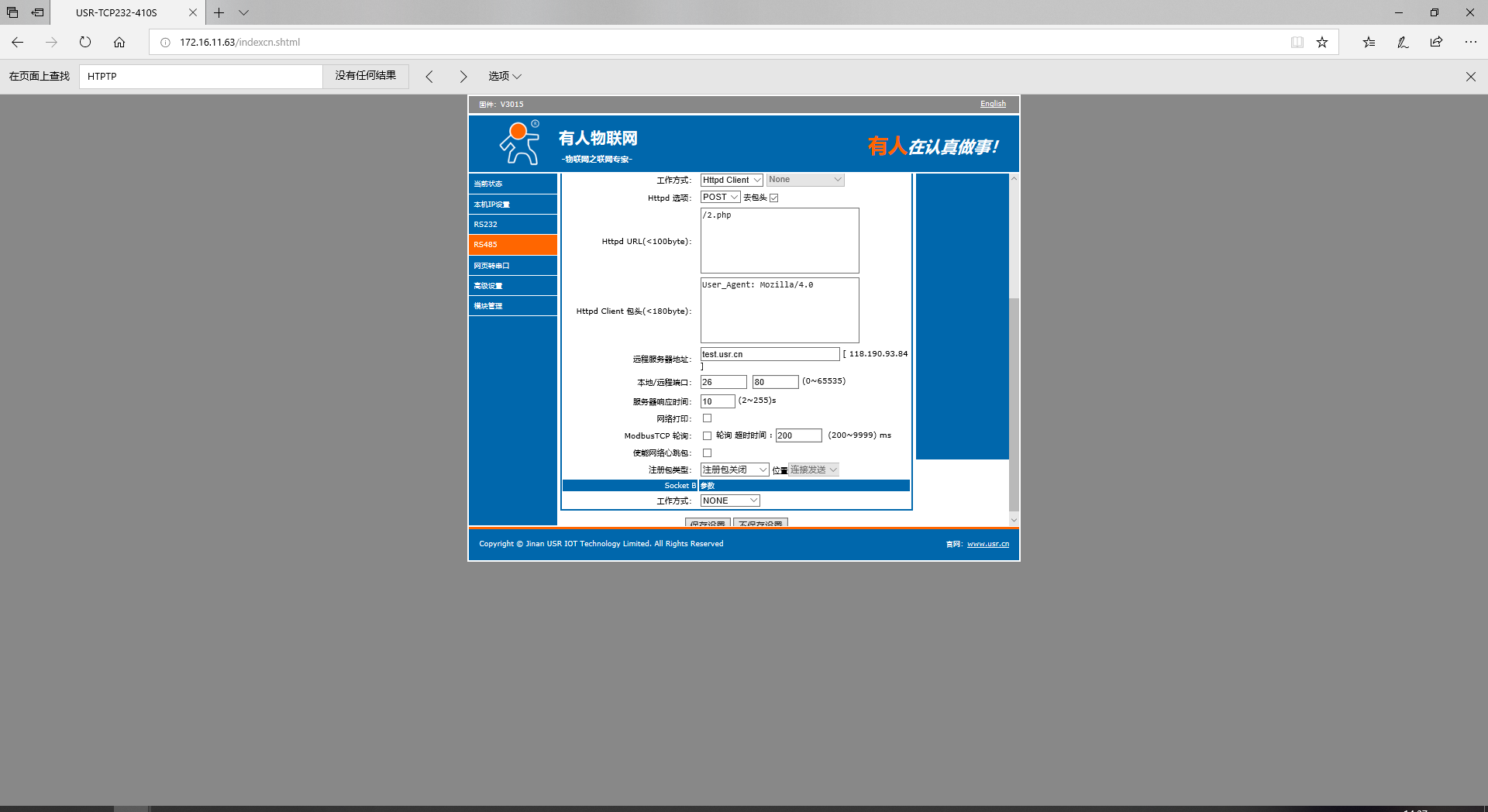 2、模塊設(shè)置參數(shù):打開設(shè)置軟件,模塊設(shè)置為Httpd Client模式,請求方式POST,URL為/2.php,設(shè)置服務(wù)器地址test.usr.cn,端口80,設(shè)置并保存所有參數(shù),重啟模塊。(本說明文檔使用為有人測試服務(wù)器)