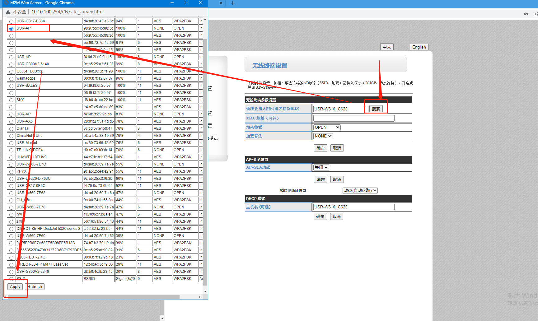 6. 無線終端設(shè)置: 搜索---選擇需要加入的路由器名稱---應(yīng)用(Apply)
