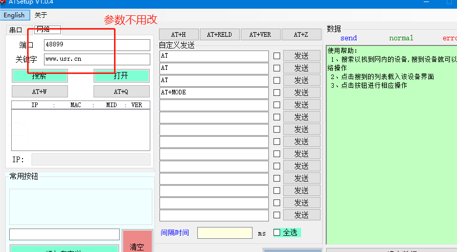 在這個選項中,可以設(shè)置W610的串口參數(shù)以及網(wǎng)絡(luò)參數(shù),客戶可以根據(jù)實際情況確認(rèn)是否需要修改波特率以及W610的網(wǎng)絡(luò)工作模式,在本案例中不做修改,采用默認(rèn)狀態(tài)。