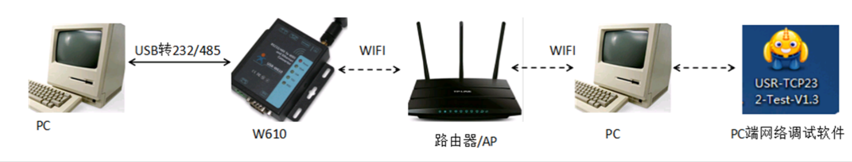 1、硬件連接:W610接上wifi天線,串口通過USB轉(zhuǎn)232/485接到PC,上電。W610正常啟動后,電源指示燈常亮,work指示燈閃爍。
