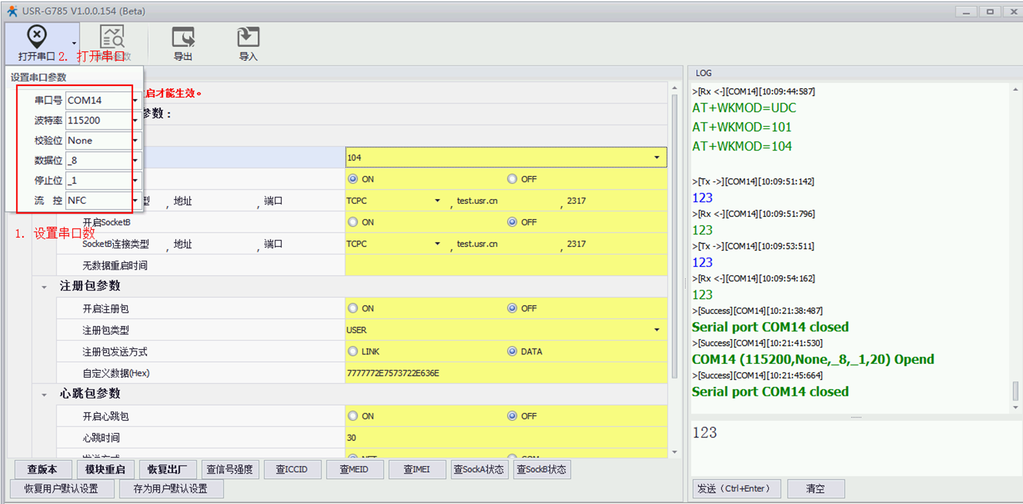 B.可以先讀取下參數(shù),可以看到,出廠默認(rèn)是工作的“NET”模式,服務(wù)器是我司測試服務(wù)器:test.usr.cn,端口號是:2317