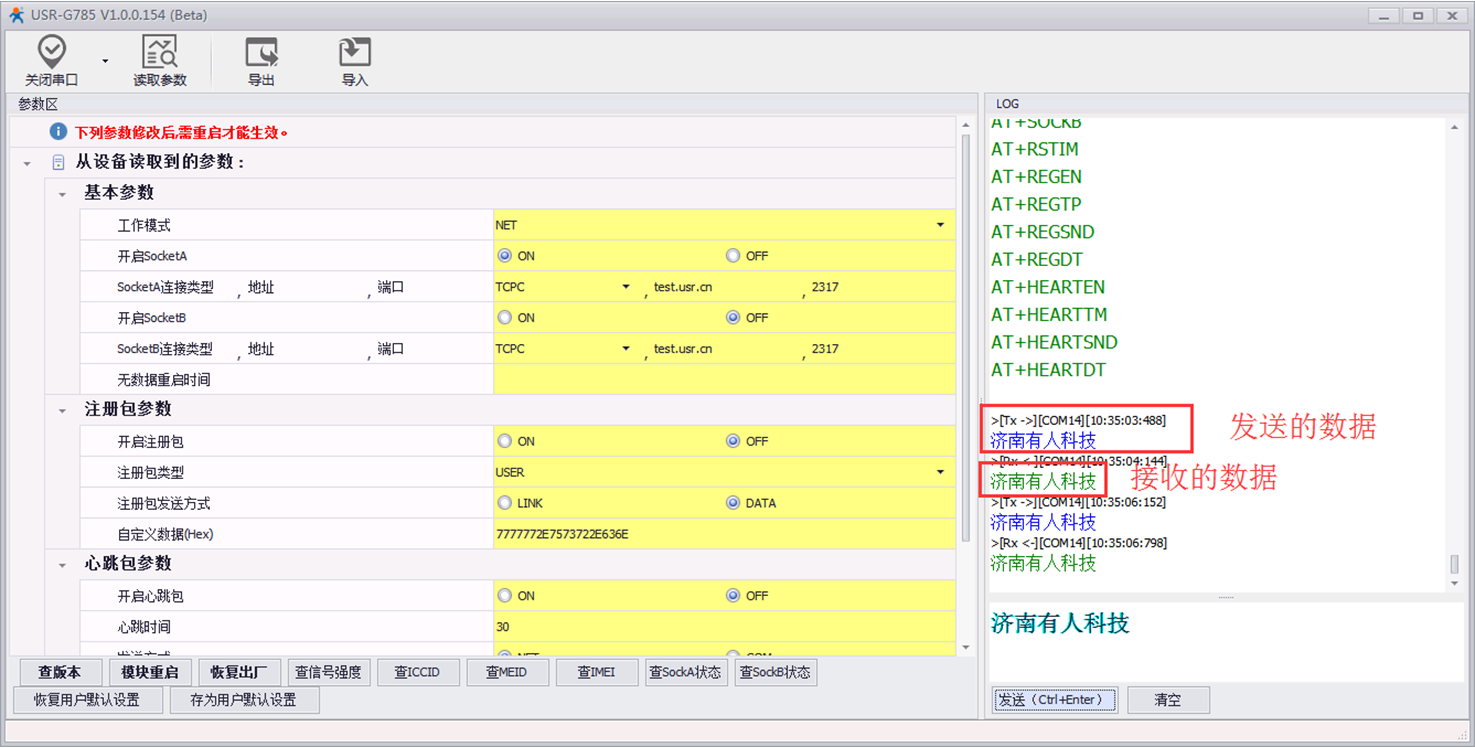 通過串口發(fā)送“濟南有人科技”,軟件上會顯示兩個“濟南有人科技’,一個是發(fā)送的數(shù)據(jù)(軟件自帶回顯功能),一個是接收到的服務(wù)器的數(shù)據(jù)(測試服務(wù)器的功能是串口發(fā)送什么數(shù)據(jù),服務(wù)器就返回什么數(shù)據(jù)),能夠收到服務(wù)器返回的數(shù)據(jù)說明785工作沒有問題。
