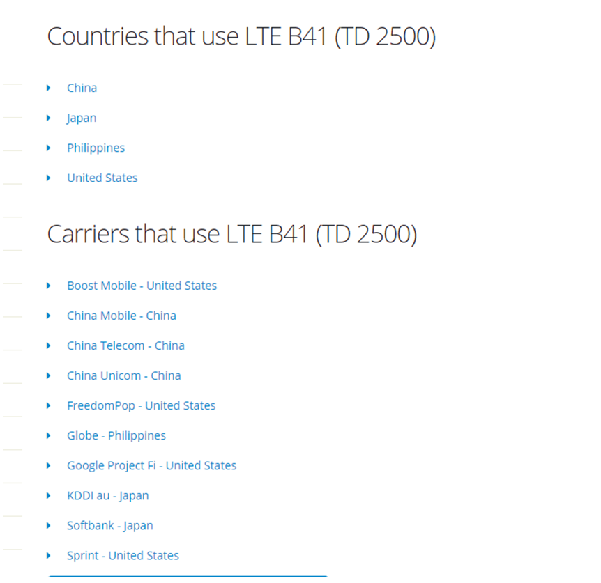 如果想查詢到底有哪些國家運營商支持B41這個頻段,直接點擊上圖中的選項,就可以看到