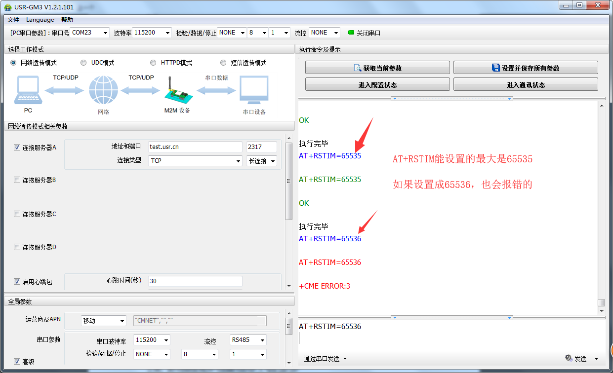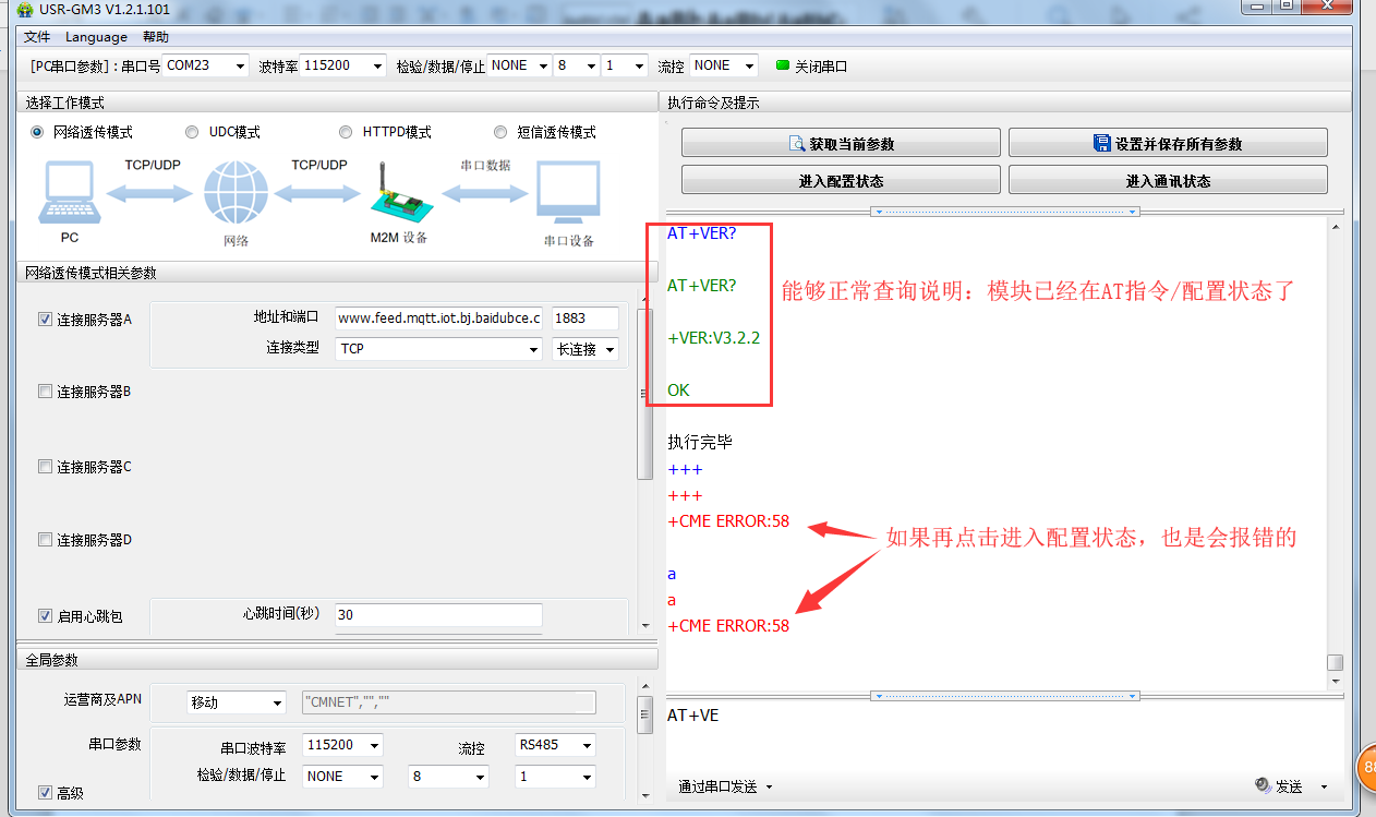 4>重復(fù)進(jìn)入AT指令狀態(tài):如果已經(jīng)在AT指令狀態(tài)了,再點(diǎn)擊進(jìn)入配置狀態(tài)會報錯,這個時候直接發(fā)送需要配置的指令即可
