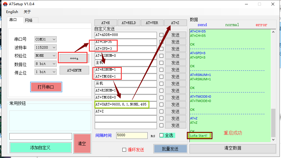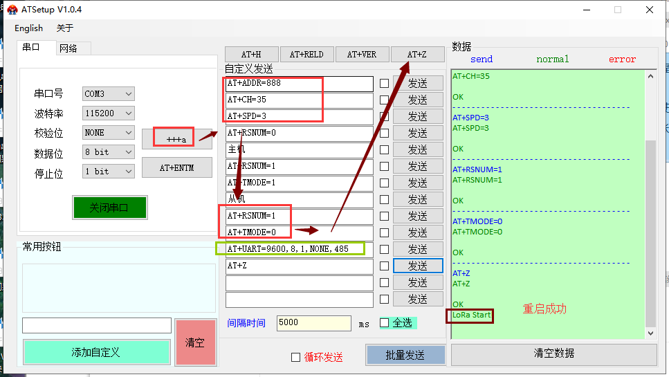 2、打開串口后先點(diǎn)擊“+++ a”,再按照順序發(fā)送指令,等待參數(shù)設(shè)置完成即可(右側(cè)數(shù)據(jù)框返回“LoRa Start!”表示設(shè)備設(shè)置完成,重啟ok;若改了口數(shù)只返回OK,不會打印“LoRa Start!”)
