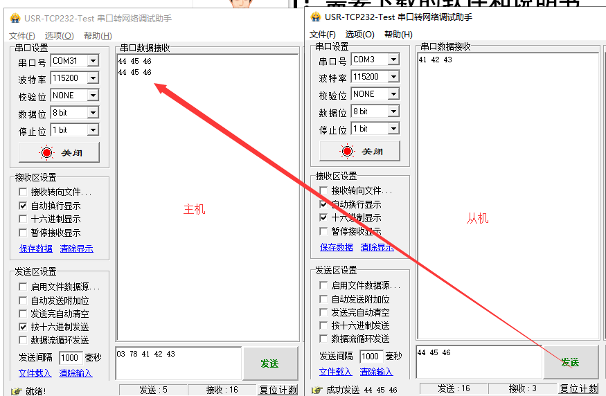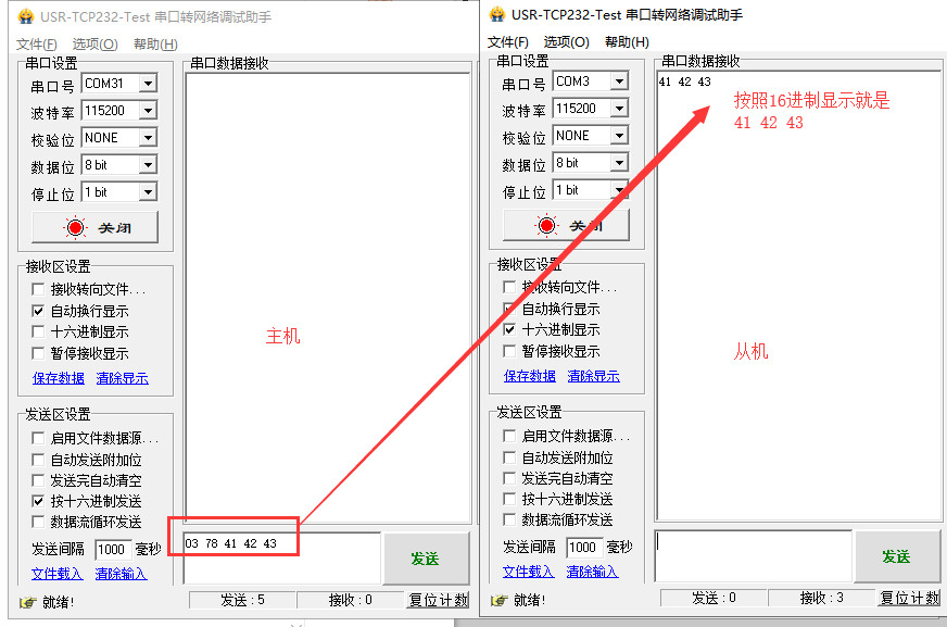 2)主機(jī)給從機(jī)發(fā)數(shù)據(jù),格式:從機(jī)NID(hex) + DATA ,例:向從機(jī)(目標(biāo)地址888(Dec))發(fā)送41 42 43(hex),則向串口輸入:03 78 41 42 43