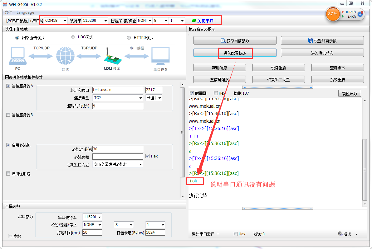 4. 點(diǎn)擊進(jìn)入配置狀態(tài),沒有收到+OK,只有3個(gè)+++