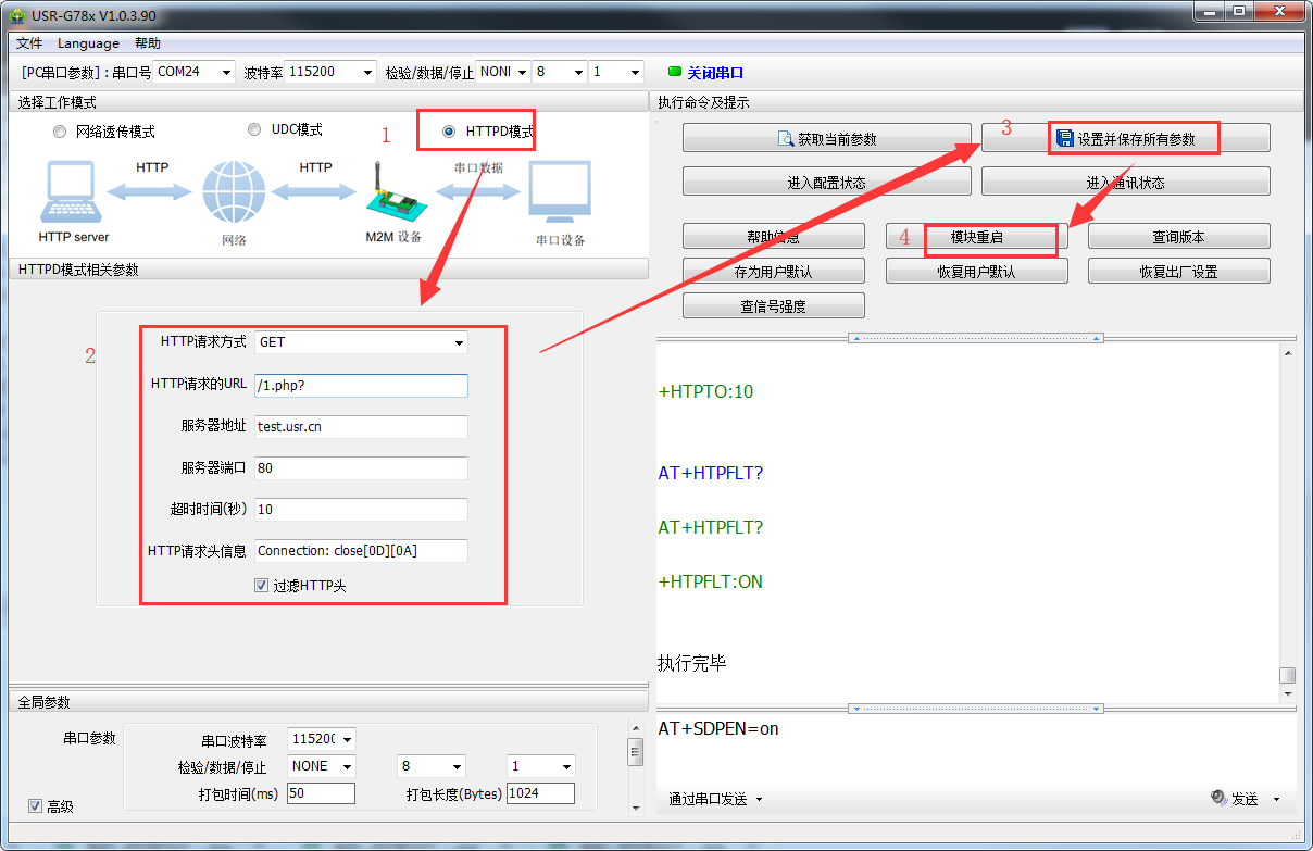 (1) 硬件連接:裝上sim卡,接上天線,780 V2的串口通過UAB轉(zhuǎn)RS232/485接到PC上,用我司提供的適配器供電。