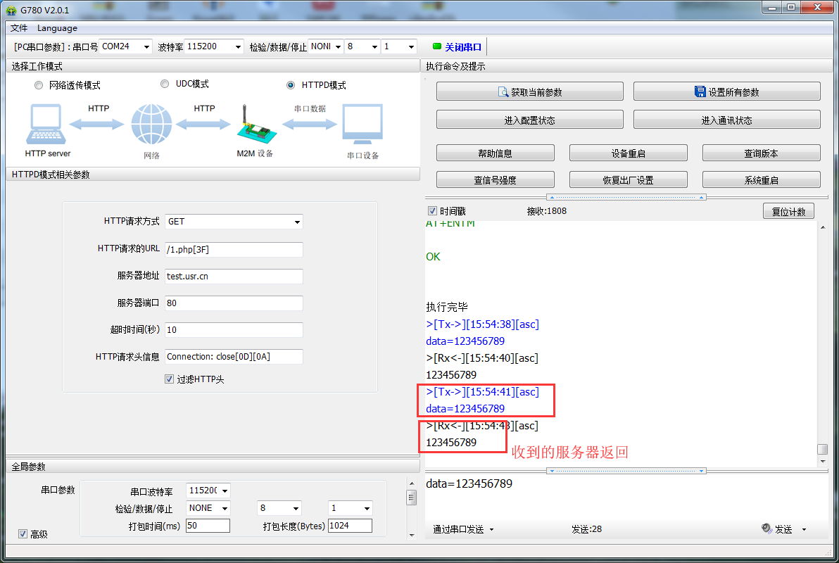 通過瀏覽器測試,發(fā)送的數(shù)據(jù)是123456789,服務(wù)器也返回了123456789,這個(gè)過程是單獨(dú)的測試服務(wù)器是否能正常工作,確定服務(wù)器是ok的,下面就是DTU和服務(wù)器的配合測試。
