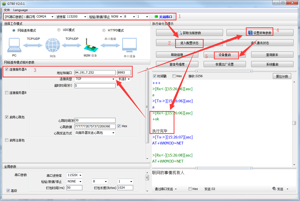 打開串口--->進(jìn)入配置狀態(tài)--->成功的話,會(huì)返回執(zhí)行完畢--->修改服務(wù)器地址和端口--->設(shè)置并保存參數(shù)--->模塊重啟