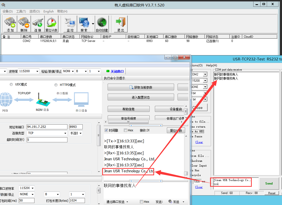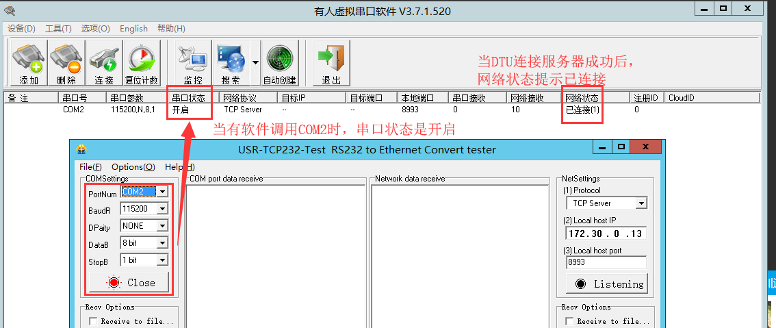 DTU串口和虛擬串口雙向數(shù)據(jù)收發(fā)結(jié)果見下圖