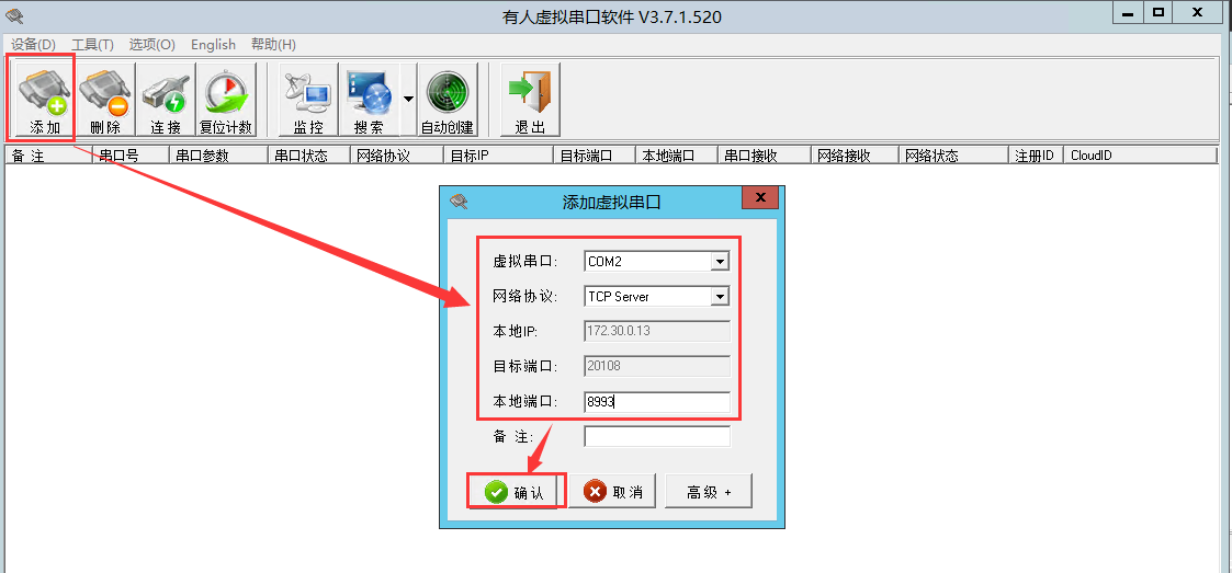 4. 有時(shí)客戶的服務(wù)器端安裝的軟件需要通過串口來讀取數(shù)據(jù),這個(gè)可以通過我司的虛擬串口實(shí)現(xiàn)。安裝虛擬串口后,設(shè)置方法:添加虛擬串口-->選擇COM口-->TCP server(軟件會(huì)自動(dòng)鎖定本地IP)-->設(shè)置本地端口號(hào)(和DTU設(shè)置的服務(wù)器端口號(hào)一致,本案例中是8993)-->確認(rèn)