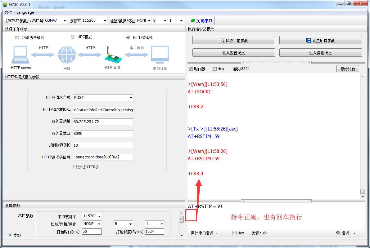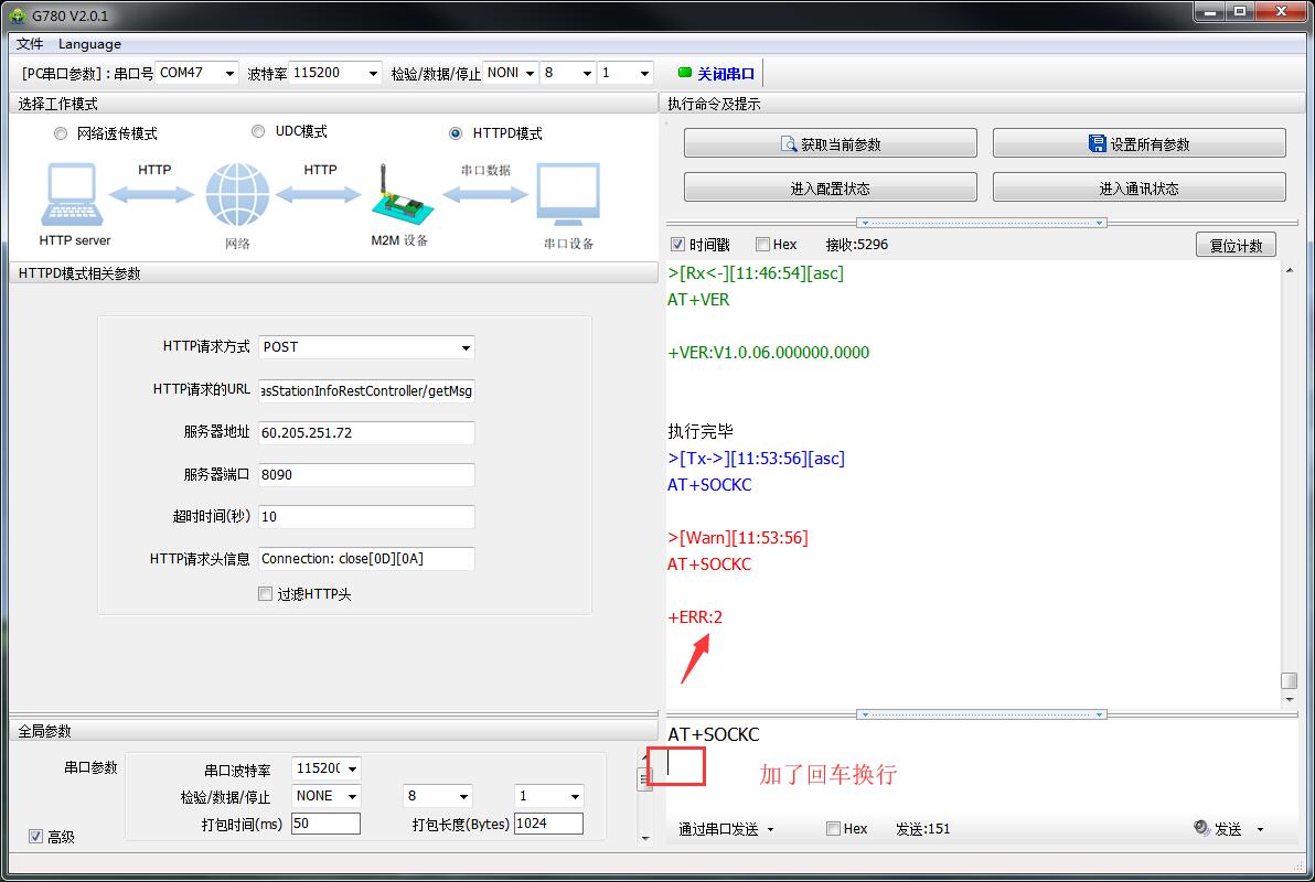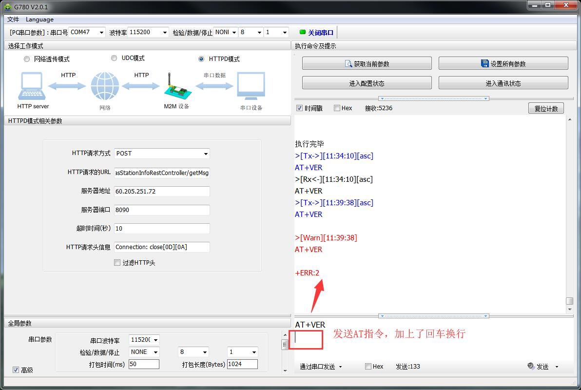 注意:我司設(shè)備發(fā)送AT指令時,AT指令的最后一定要加回車換行