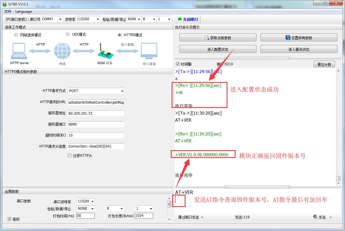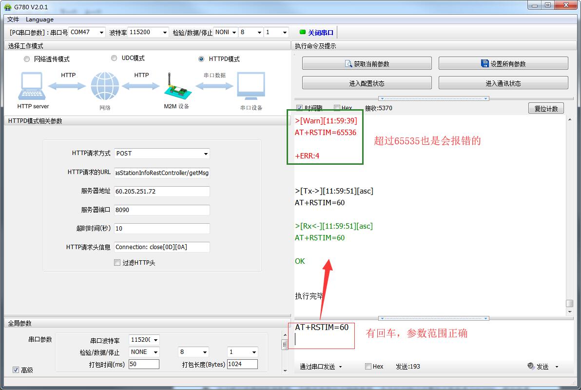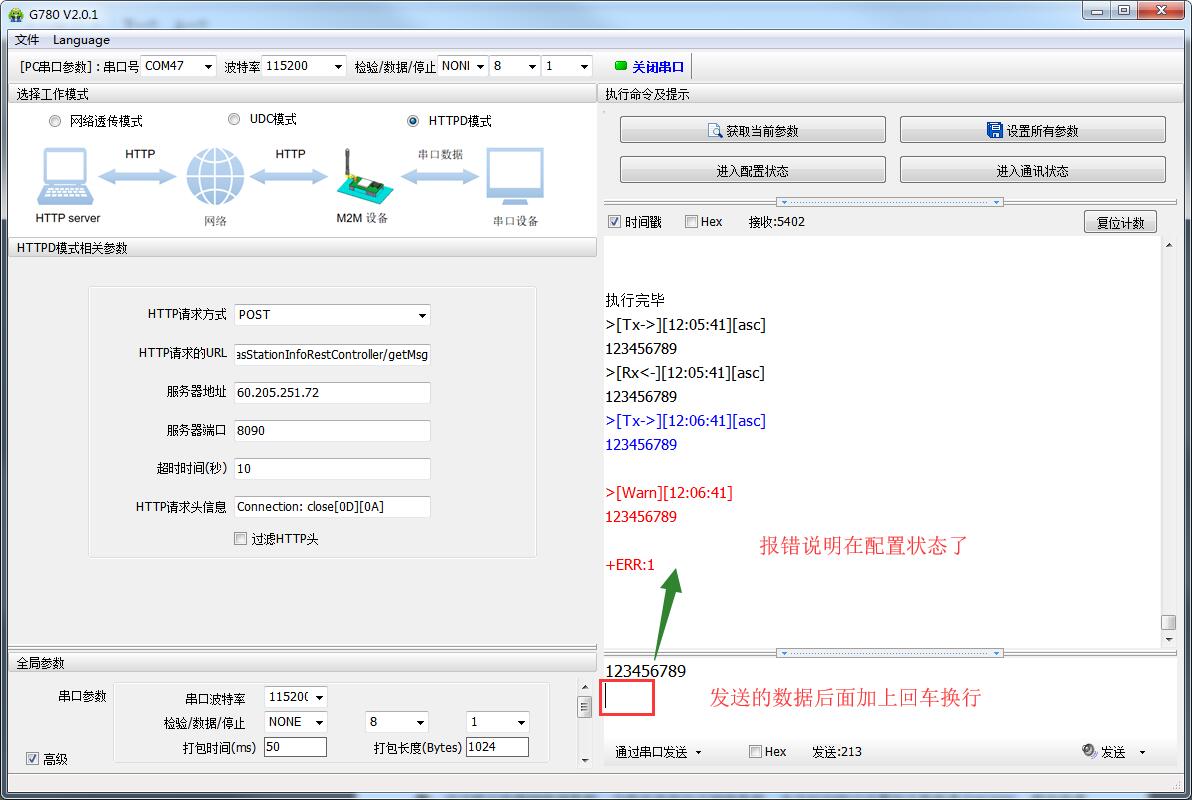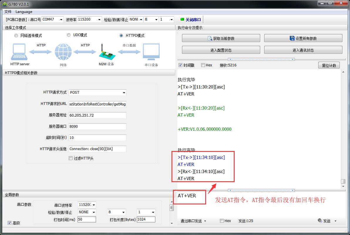 注意:我司設(shè)備發(fā)送AT指令時,AT指令的最后一定要加回車換行