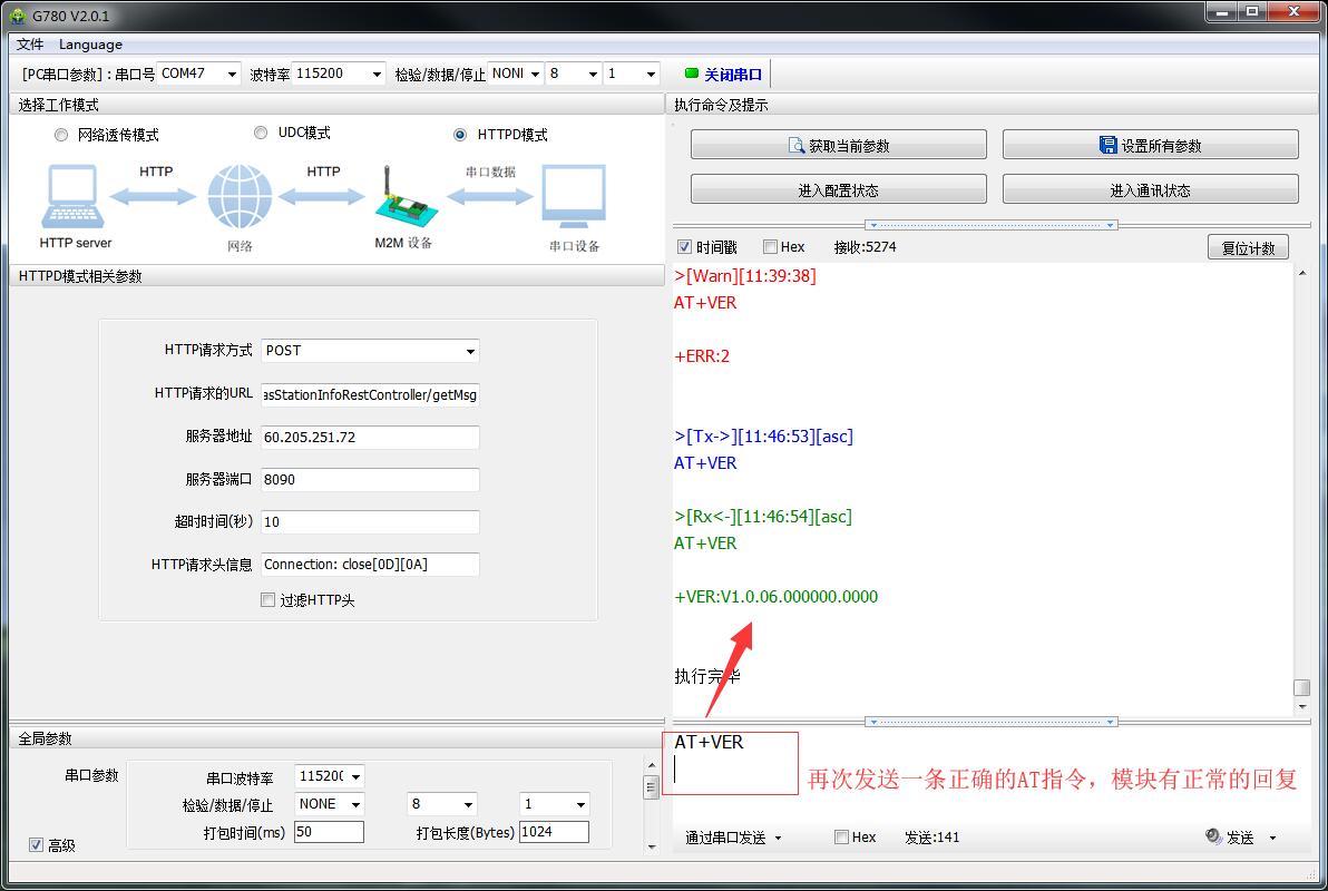 上面已經(jīng)正確進入配置狀態(tài),如果我發(fā)送的AT指令不帶回車換行的話,模塊既不報錯也不返回正確的指令,這是因為在配置狀態(tài)的時候,回車換行是AT指令的結(jié)束符,如果沒有收到回車換行,模塊就認為這條指令沒有結(jié)束,一直在等待接收后面的指令。并且這個現(xiàn)象看著和我司的測試服務器通訊是一樣的,就容易導致無法判斷問題,所以在發(fā)送AT指令的時候,一定要加上回車換行