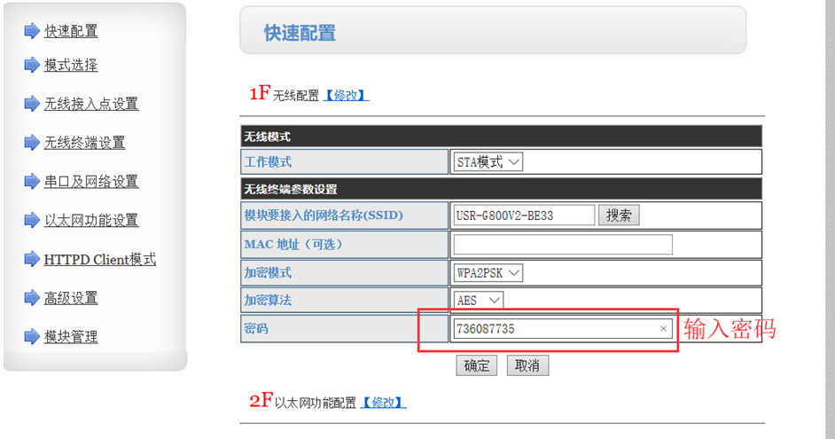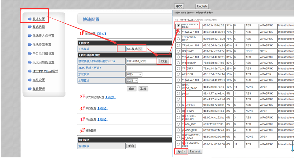(1)點擊快速配置,選擇STA工作模式,點擊搜索,搜索路由器,選擇要連接的路由器
