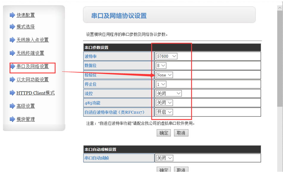 3、點擊串口及網絡設置,相應設置如下:(波特率可根據自己需要設置) 點擊確定