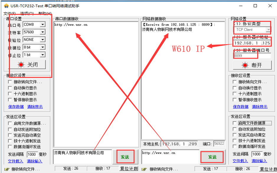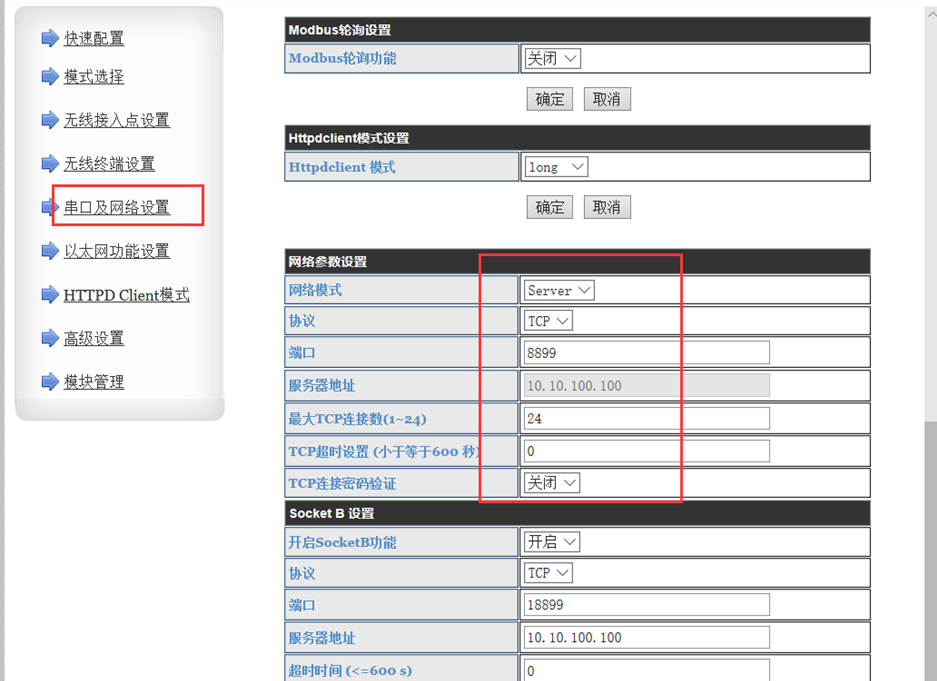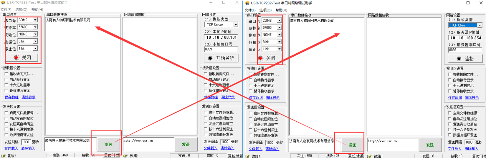 (1)第一種結果測試方法:打開有人串口轉網絡調試助手,參數配置如圖