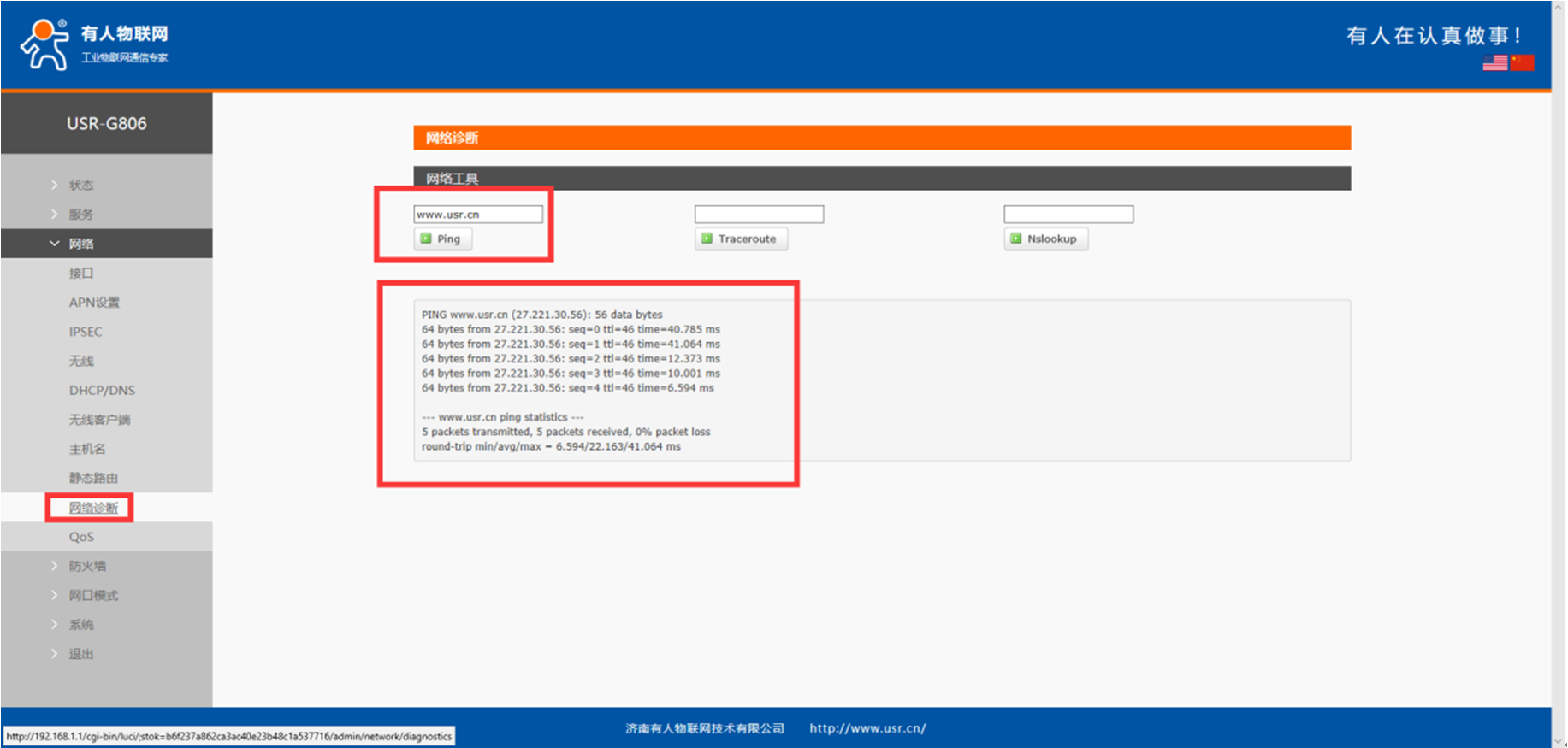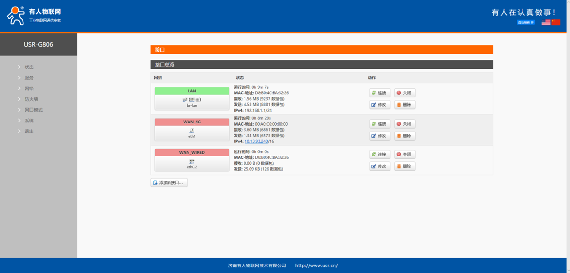 3、 打開瀏覽器,地址欄輸入192.168.1.1,進入G806的設(shè)置網(wǎng)頁,用戶名密碼都是root(注意:不要使用360瀏覽器),點擊網(wǎng)絡(luò)---接口界面,可以看到當(dāng)前有三個接口,LAN、WAN-4G、WAN-WIRED,分別是局域網(wǎng)接口,4G接口,有線網(wǎng)接口。(注意:LAN接口網(wǎng)段和其他的WAN接口IP網(wǎng)段不能沖突。)