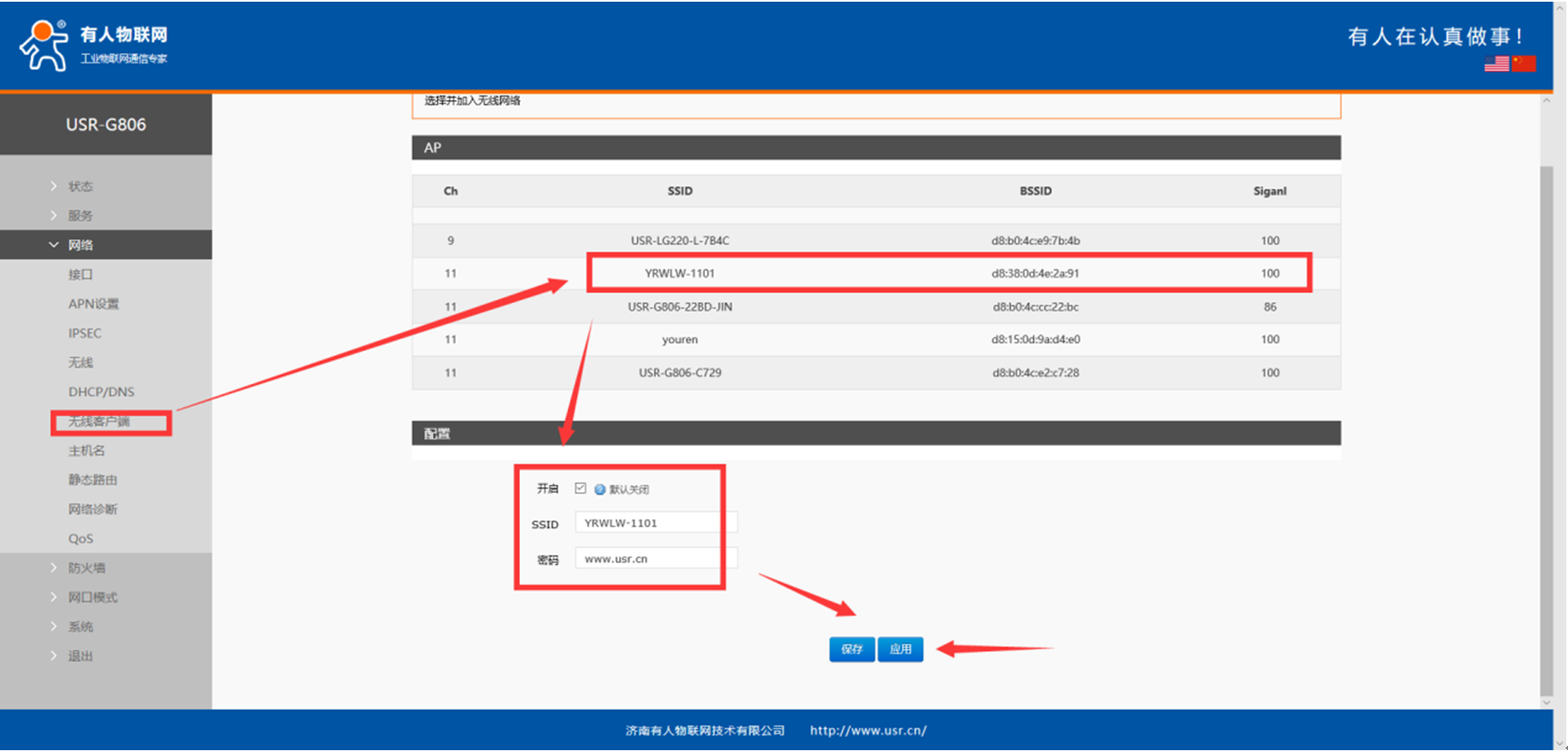 若此時看不到該接口獲取到的IP以及上下行數(shù)據(jù),可以嘗試多次點擊網(wǎng)絡(luò)—無線客戶端界面的應(yīng)用按鈕,并嘗試重啟,待設(shè)備重啟后,等待片刻,查看接口是否獲取到IP。一般情況下經(jīng)過以上操作便可鏈接。