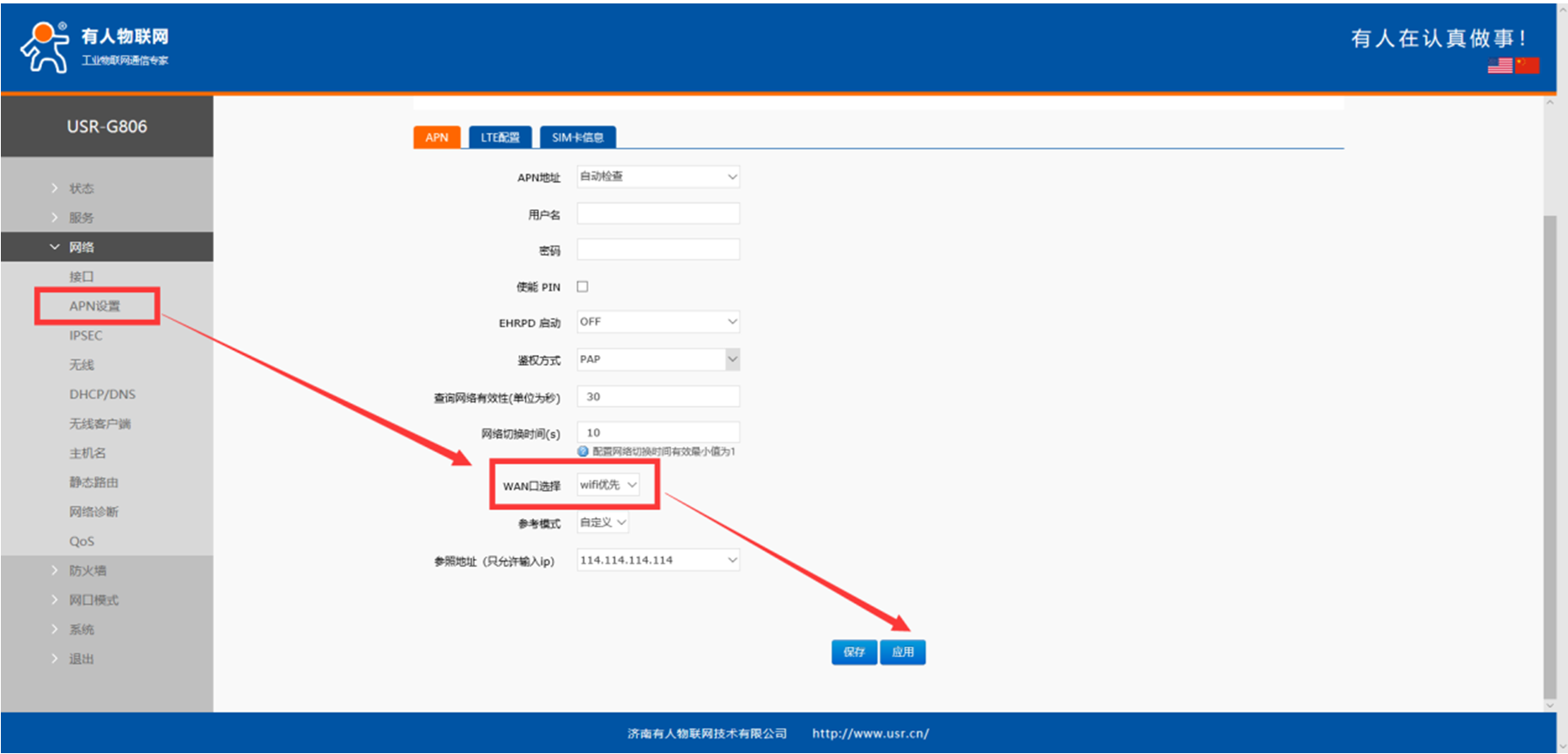 5、 在網(wǎng)絡(luò)---APN設(shè)置界面選擇WiFi優(yōu)先,并應(yīng)用,設(shè)備則會優(yōu)先選擇WiFi上網(wǎng)(默認(rèn)有線優(yōu)先)