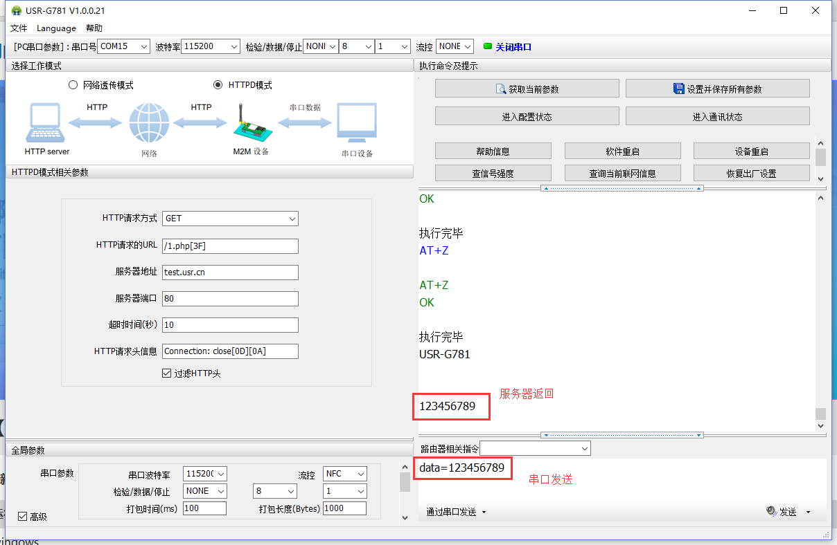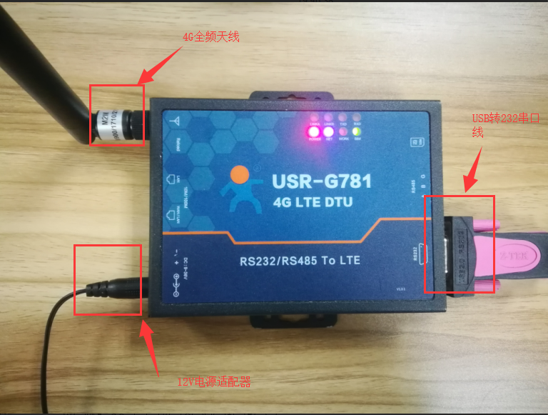 (1) 硬件連接:裝上sim卡,接上天線,G781的串口通過USB轉(zhuǎn)RS232/485接到PC上,用我司提供的12V電源適配器供電。