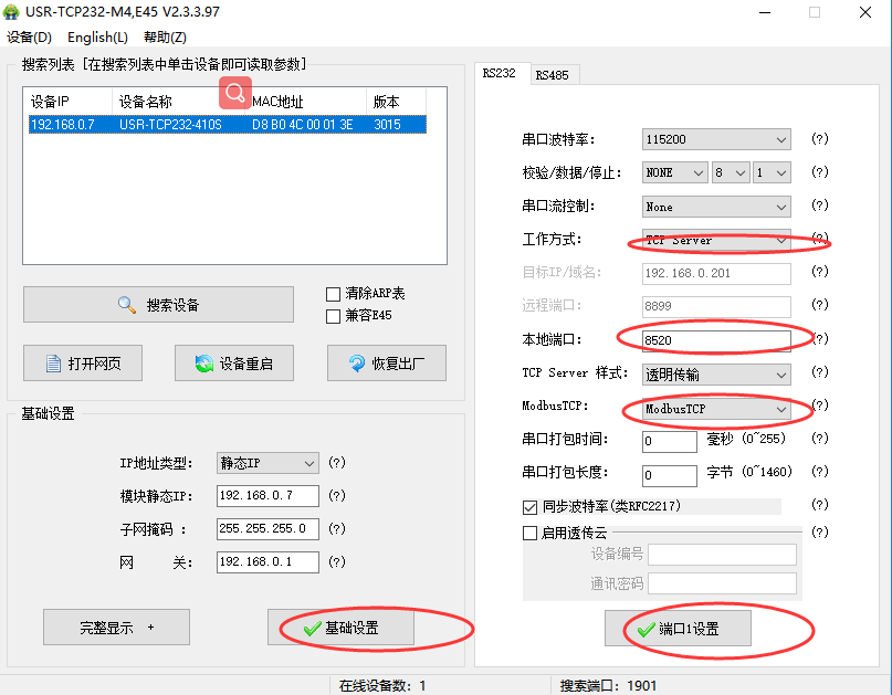 2. 打開設(shè)置軟件:USR-TCP232-M4-setup-V2.3.3.97,然后工作方式選擇“TCP SEVER”然后將本地端口號設(shè)置為“8520”,將modbus 改為“modbus tcp”然后端口1設(shè)置確定下,然后設(shè)備重啟下。