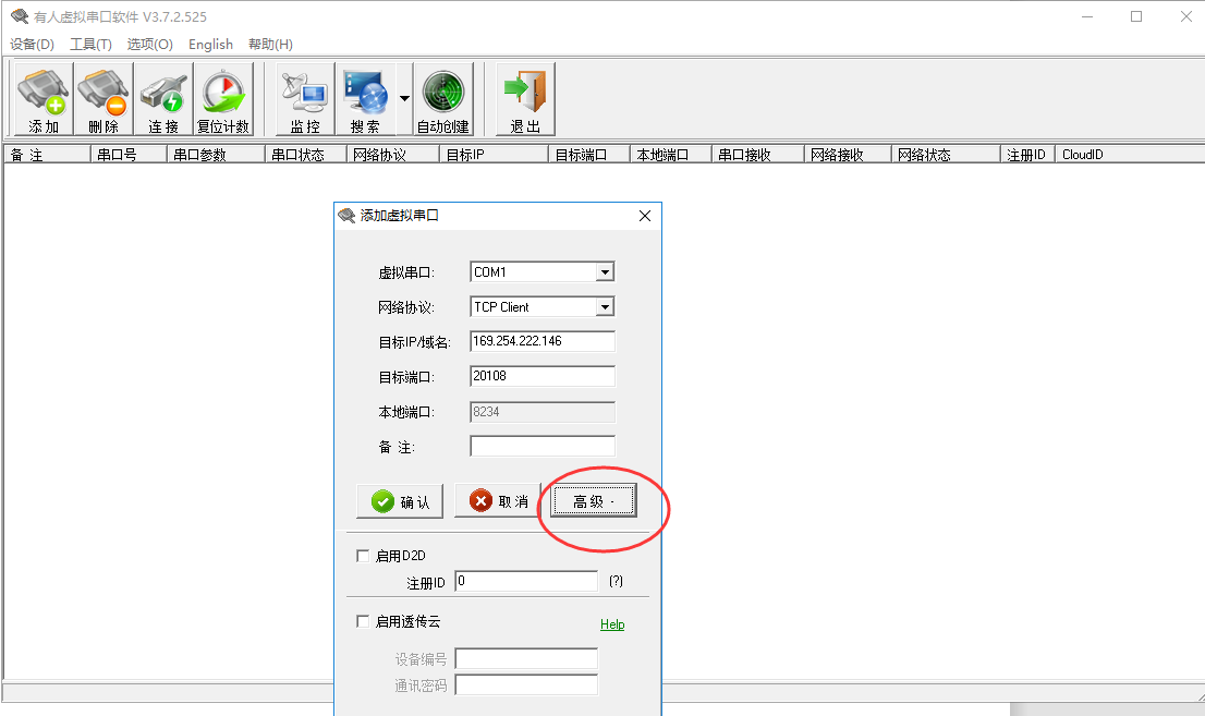 1. 手動(dòng)添加虛擬串口按鍵,他可以根據(jù)模塊的配置信息手動(dòng)添加虛擬串口,如果是需要將虛擬串口軟件鏈接到透傳云,要通過這個(gè)高級(jí)設(shè)置啟用透傳云,然后將設(shè)備和透傳云建立鏈接。