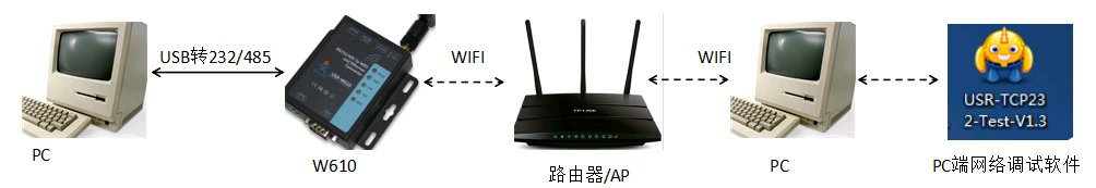 1. 硬件連接:W600接上wifi天線,串口通過USB轉(zhuǎn)232/485接到PC,上電。W600正常啟動后,電源指示燈常亮,work指示燈閃爍。