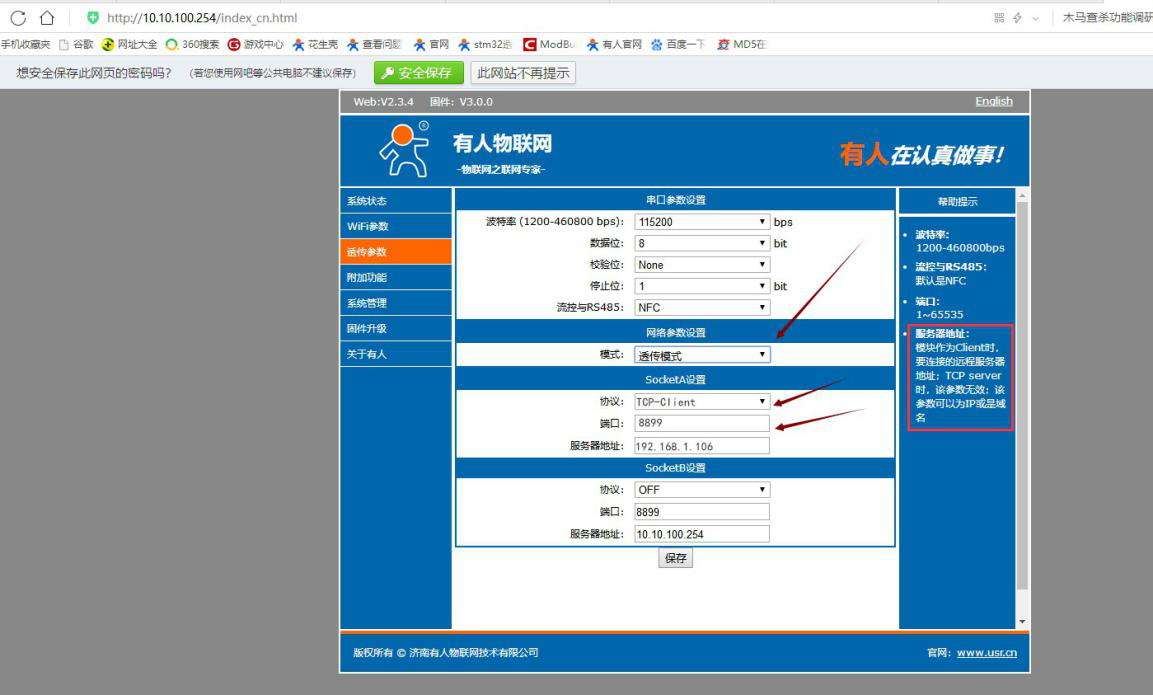 在這個選項中,可以設(shè)置W600的串口參數(shù)以及網(wǎng)絡(luò)參數(shù),客戶可以根據(jù)實際情況確認(rèn)是否需要修改波特率以及W600的網(wǎng)絡(luò)工作模式,W600做TCP Client,連接副武器的ip和端口(此時,電腦做服務(wù)器,就需要設(shè)備連接電腦的ip和端口)