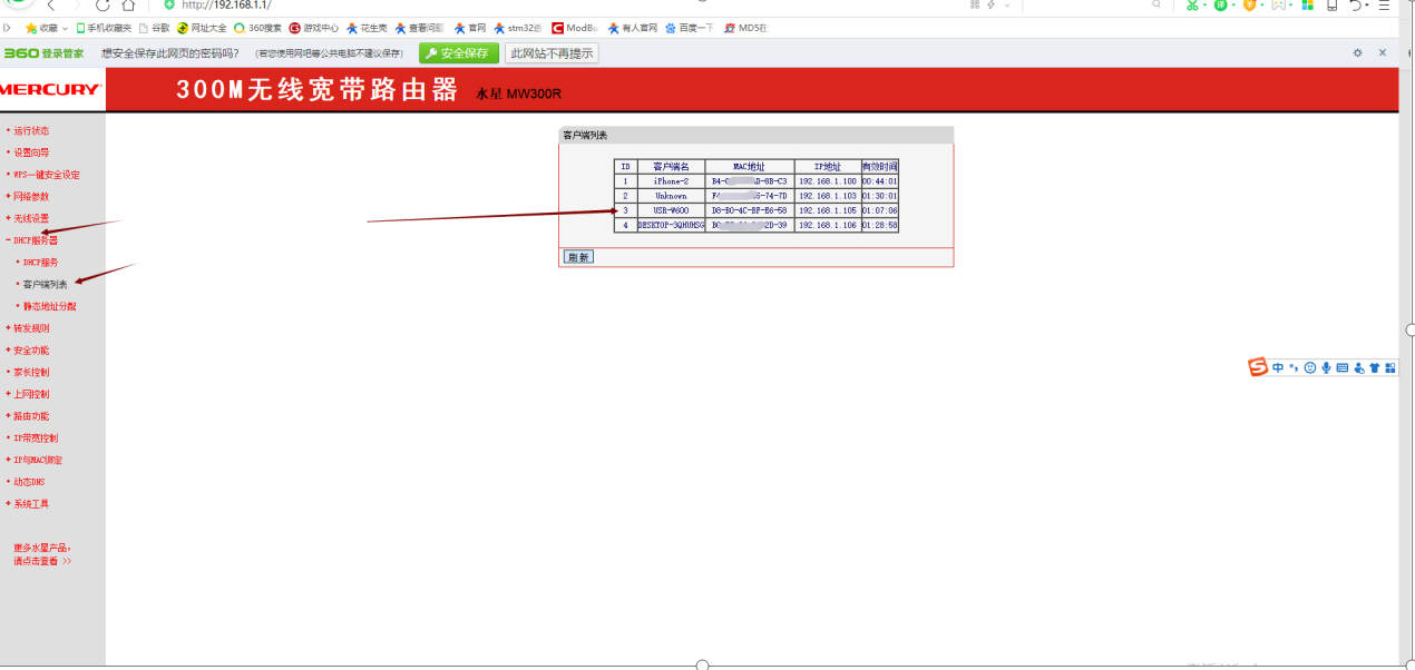 可以在路由器的管理界面查看W600的IP為192.168.1.105