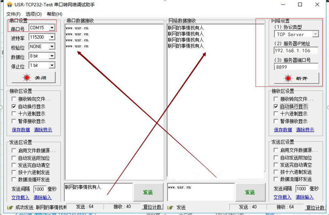 串口和網(wǎng)絡(luò)相互收發(fā)數(shù)據(jù)成功,說明通訊是正常的