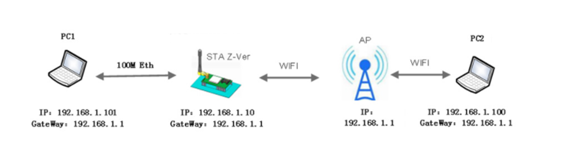 USR-W610模塊(以下簡(jiǎn)稱W610)通過(guò)Wi-Fi接到AP上,PC1通過(guò)以太網(wǎng)接到W610模塊上,這時(shí)W610模塊相當(dāng)于一個(gè)透明的設(shè)備,PC1和PC2在同一個(gè)局域網(wǎng),相互通訊不受任何限制,如果AP可以聯(lián)網(wǎng),那么PC1也是可以上網(wǎng)的。下面介紹如何設(shè)置A2模塊,才能實(shí)現(xiàn)這種功能。