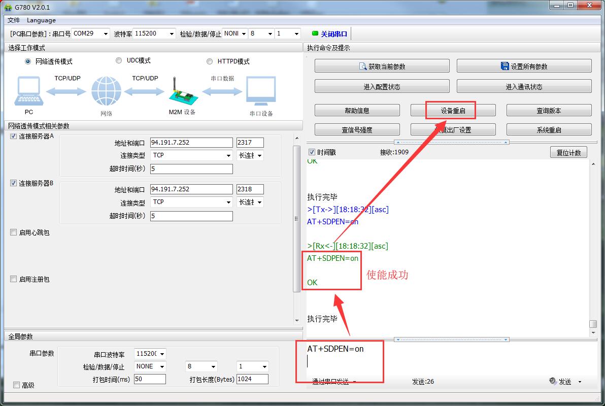 2.使能socket套接字分發(fā)功能:發(fā)送AT+SDPEN=on,然后重啟設(shè)備使設(shè)置生效