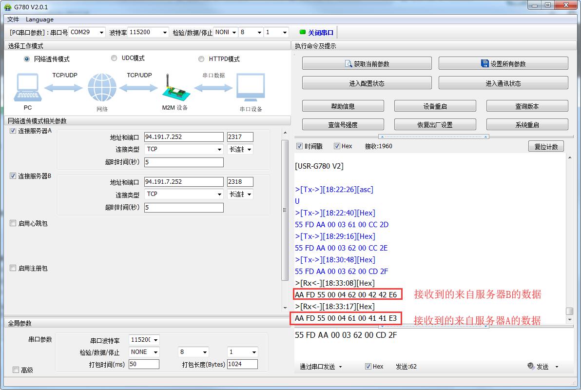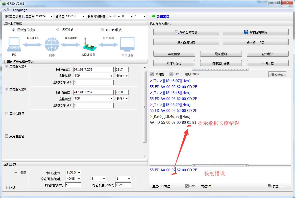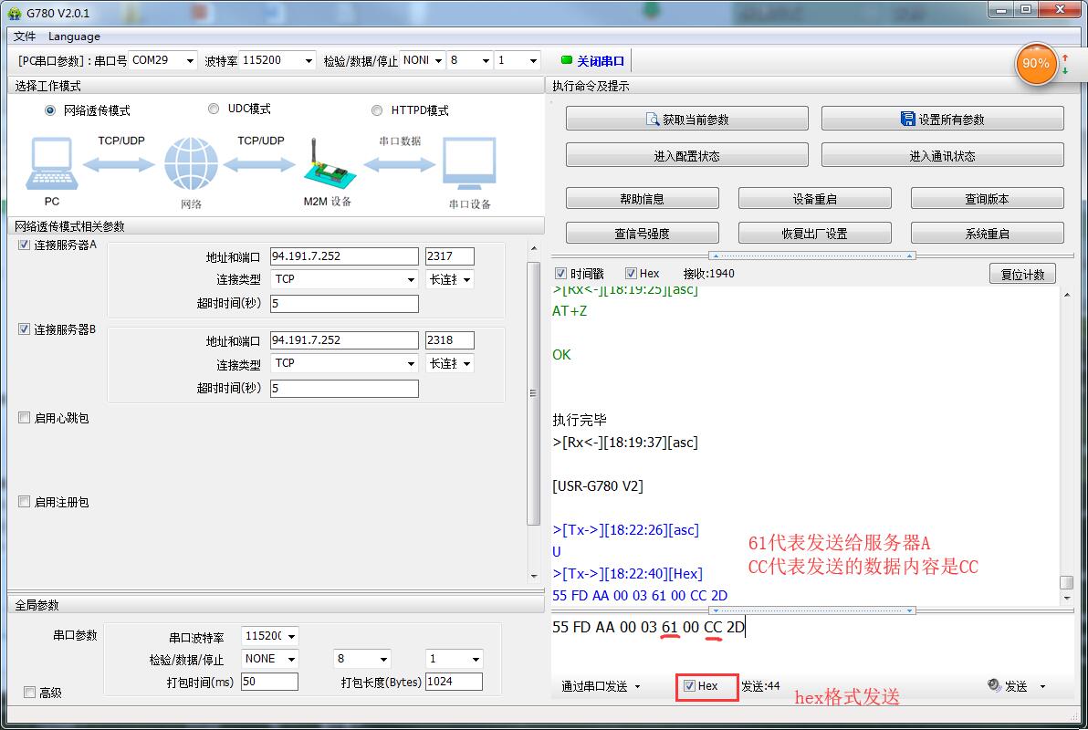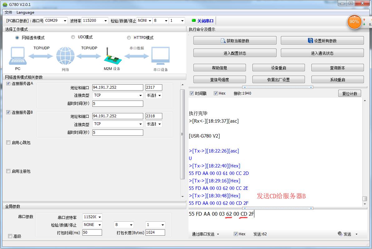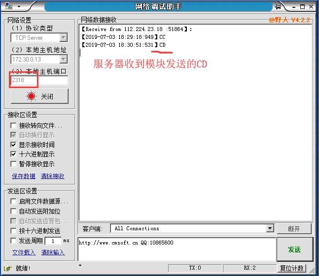 3.重啟后,模塊會主動(dòng)連接服務(wù)器,通過串口發(fā)送指定格式的數(shù)據(jù)出去。