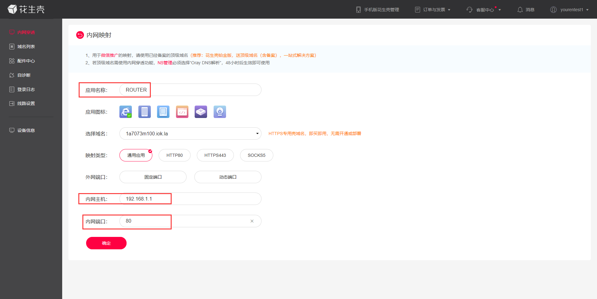 5、應(yīng)用名稱可以自定義,以便于自己區(qū)分。應(yīng)用圖標(biāo)、應(yīng)用域名、映射類型、外網(wǎng)端口可以根據(jù)自己需求來選擇,有些選項是收費的。(具體收費細(xì)則可咨詢花生殼的相關(guān)銷售和技術(shù),本功能是第三方應(yīng)用,我司不對其進(jìn)行收費等業(yè)務(wù)辦理。)在這里如下設(shè)置。內(nèi)網(wǎng)主機填寫路由器的LAN口IP地址,端口是80(路由器的內(nèi)置網(wǎng)頁固定端口,不可修改).設(shè)置完成后點擊確定。