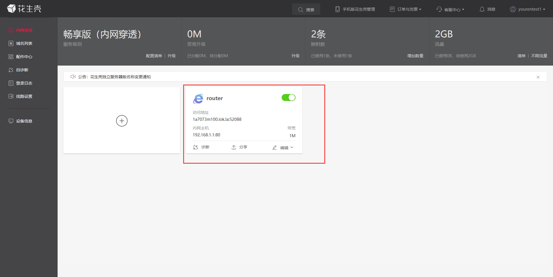 4、左側(cè)導(dǎo)航欄點擊進(jìn)入花生殼內(nèi)網(wǎng)穿透,點擊頁面上的+,進(jìn)入配置。(默認(rèn)免費版本一個賬號可以免費設(shè)置兩個內(nèi)網(wǎng)穿透。)